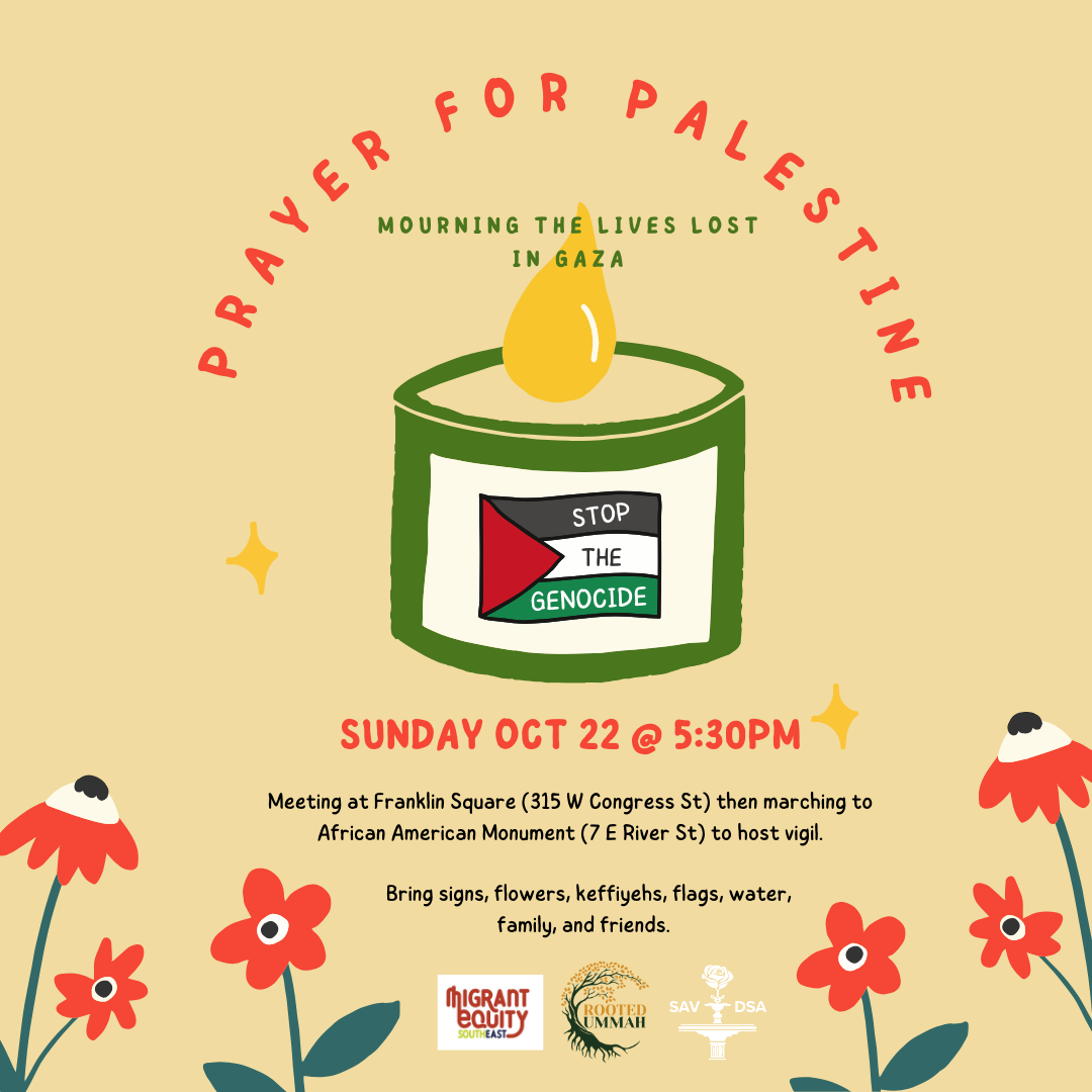 Join ROOTED UMMAH, Migrant Equity and DSA-SAV and thousands of others all over the globe to Pray for Palestine and mourn the lives lost in Gaza.